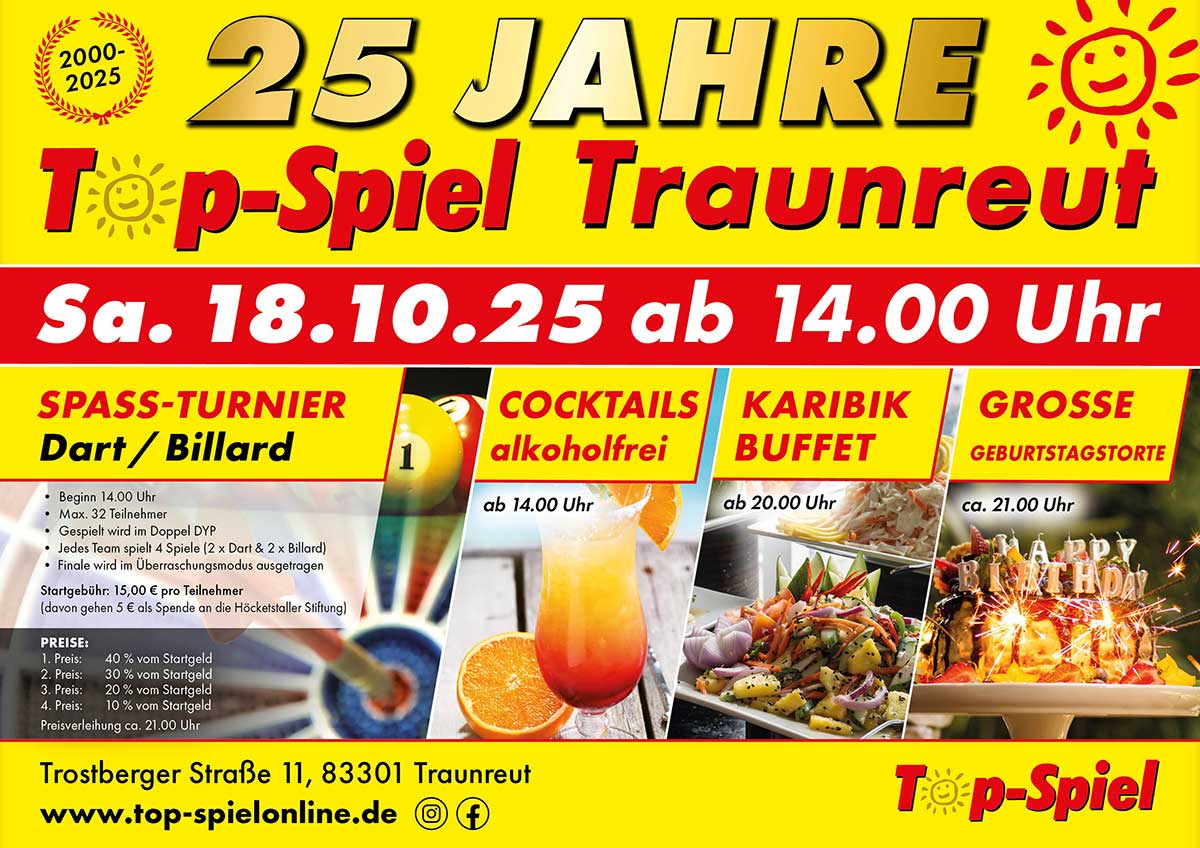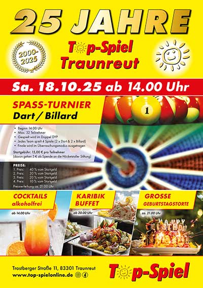 Diesen Anlass nehmen wir um am 18.10.2025 ab 14.00 Uhr ordentlich in unserer Traunreuter Filiale zu feiern, u.a. mit einem Dart/Billard-Spaßturnier, einem Karibik-Buffet, alkoholfreien Cocktails und einer großen Geburtstagstorte. Kommt gerne vorbei und feiert mit uns – Wir freuen uns auf euch!